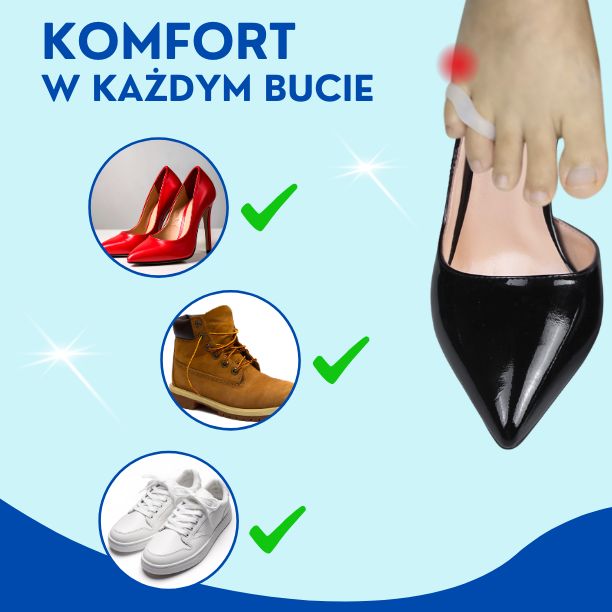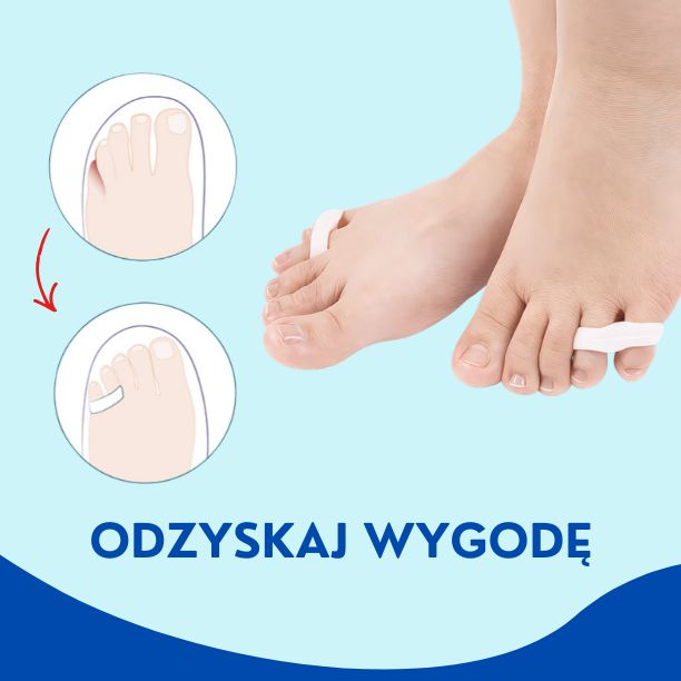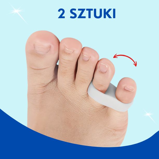 Separator żelowy na mały palec stopy – pomaga skorygować jego ułożenie i zapobiega nachodzeniu palców, zmniejszając dyskomfort. Wykonany z miękkiego, elastycznego żelu, dopasowuje się do stopy i nie przeszkadza w chodzeniu ani codziennych aktywnościach. Można go nosić przez cały dzień w różnych butach.